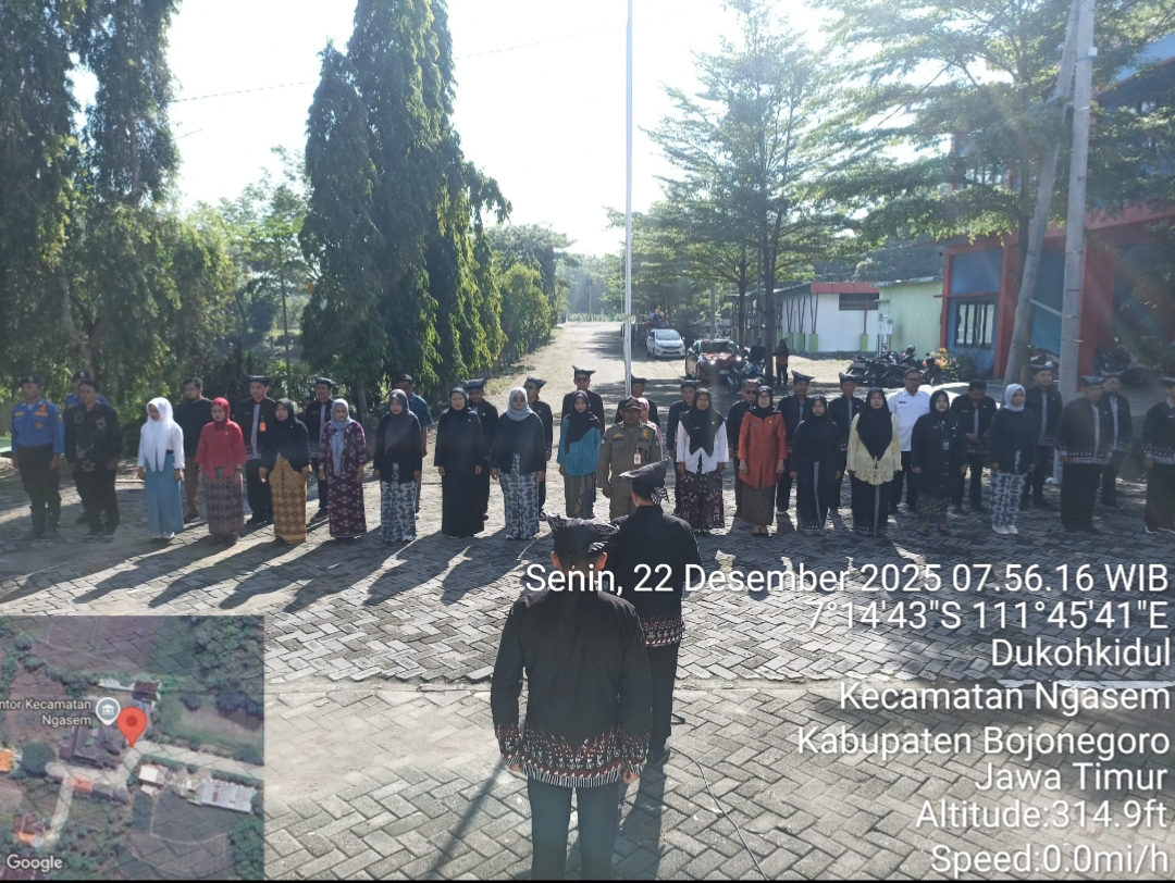 Apel Pagi yang diikuti oleh ASN Kecamatan Ngasem, Instansi Satu Atap (Dinas Dukcapil, DKPP/Penyuluh Pertanian, DP3AKB/Penyuluh KB, Damkarmat, Satpol PP), Sekretaris Desa, Pendamping Desa, TKSK dan Pendamping PKH