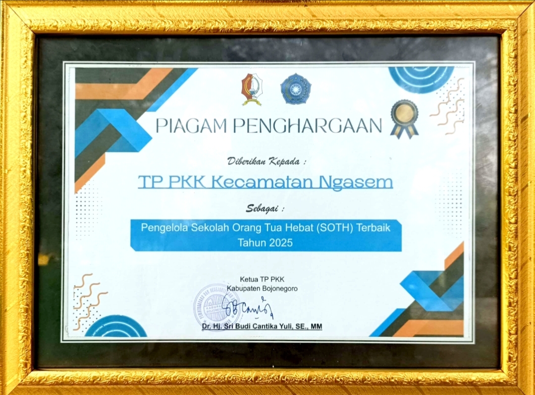 Penghargaan ini menjadi bukti nyata komitmen TP PKK Kecamatan Ngasem dalam mendukung peningkatan peran orang tua melalui program Sekolah Orang Tua Hebat sebagai upaya meningkatkan pengetahuan dan keterampilan orang tua dalam pengasuhan anak guna mewujudkan keluarga berkualitas dan sejahtera
