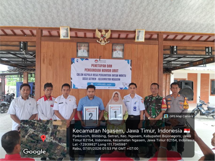 Forkopimca Kecamatan Ngasem menghadiri kegiatan Penetapan dan Pengundian Nomor Urut Calon Kepala Desa Pergantian Antar Waktu (PAW) Desa Setren, yang dilaksanakan pada Rabu, 7 Januari 2026