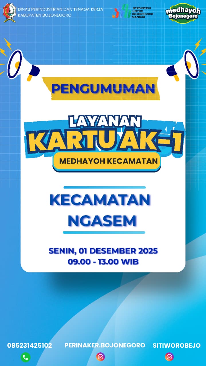 Dinas Perindustrian dan Tenaga Kerja Kab. Bojononegoro akan melakukan JEMPUT BOLA LAYANAN KARTU AK-1 di PENDOPO KEC. NGASEM pada SENIN, 1 DESEMBER 2025, Pukul 9.00 WIB - 13.00 WIB