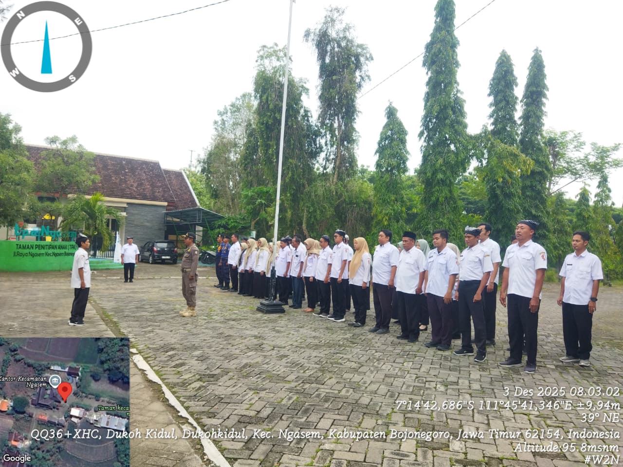 Kegiatan :Apel Pagi yang diikuti oleh ASN Kecamatan Ngasem, Instansi Satu Atap (Dinas Dukcapil, DKPP/Penyuluh Pertanian, DP3AKB/Penyuluh KB, Damkarmat, Satpol PP), Pendamping...